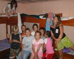Elhelyezés 7 fős emeletes ágyas, faházakban.